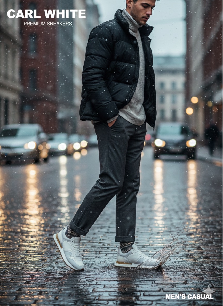 신발 하부 디자인에 중점을 두었으며, 갑피부분은 매끄럽게 가공된 누벅가죽과 천연소가죽의 조합으로