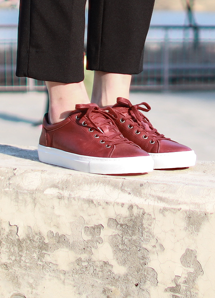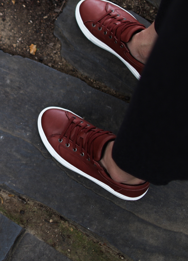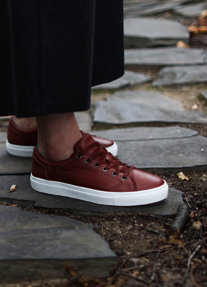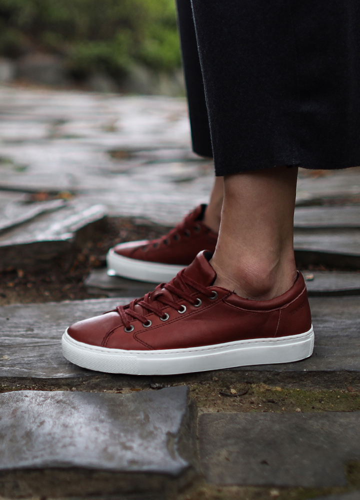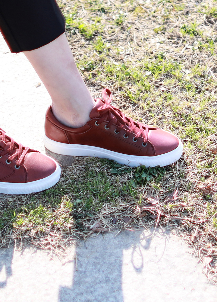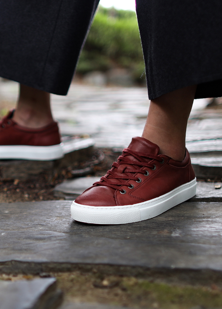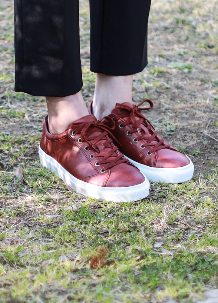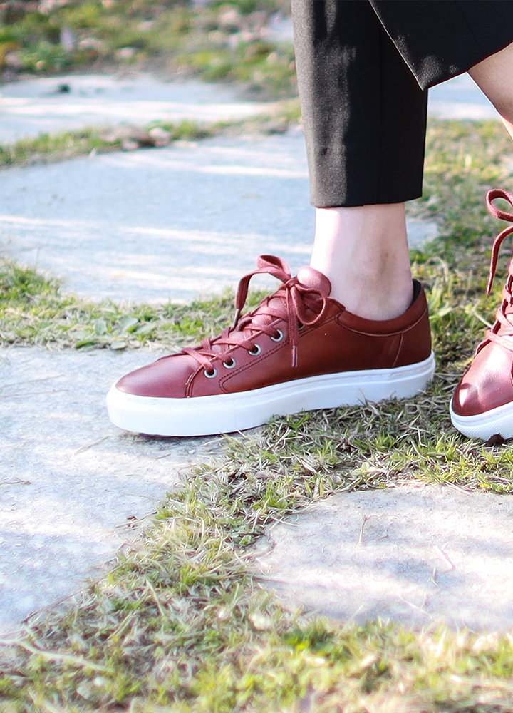 심플하면서도 깨끗한 느낌을 가지고 있으며 살짝 둥근 형태의 디자인으로 빈티지 무드의 색감을 가진 여성 스니커즈.