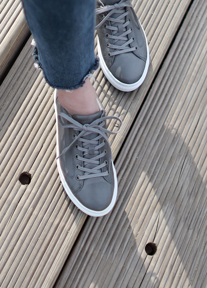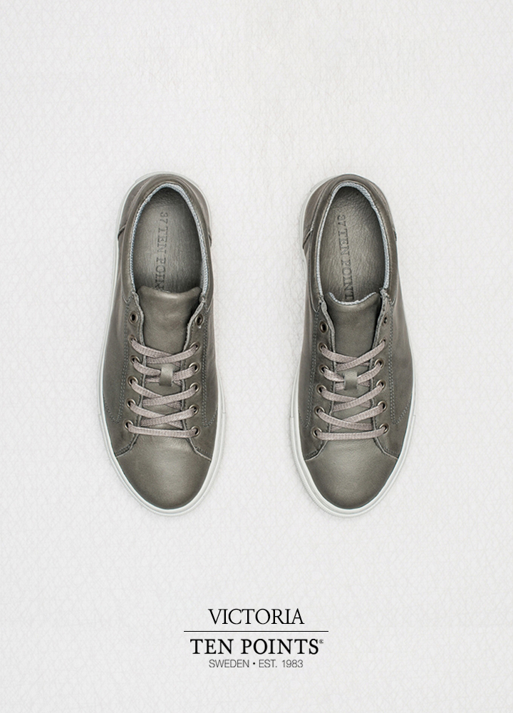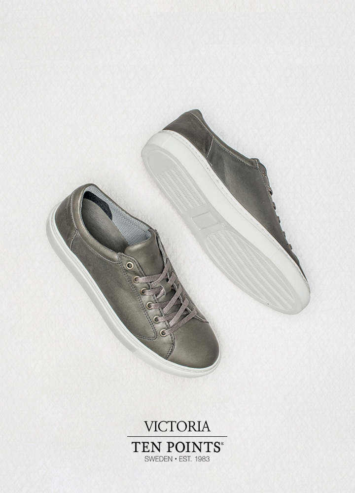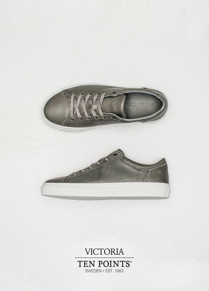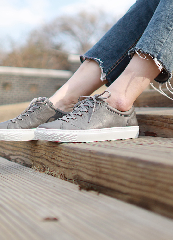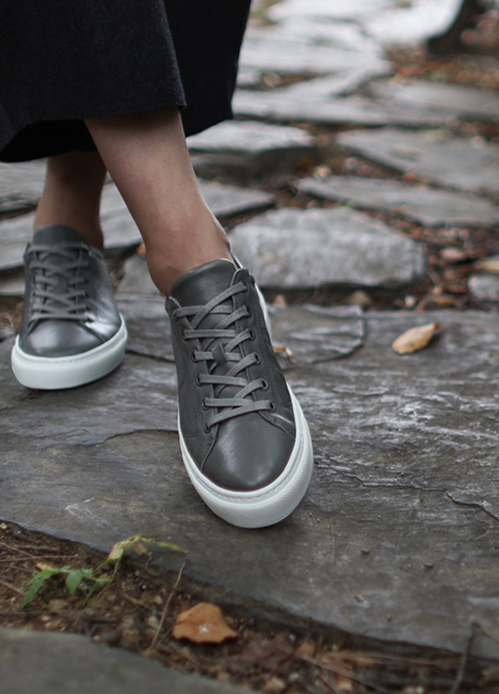 심플하면서도 깨끗한 느낌을 가지고 있으며 살짝 둥근 형태의 디자인으로 빈티지 무드의 색감을 가진 여성 스니커즈.