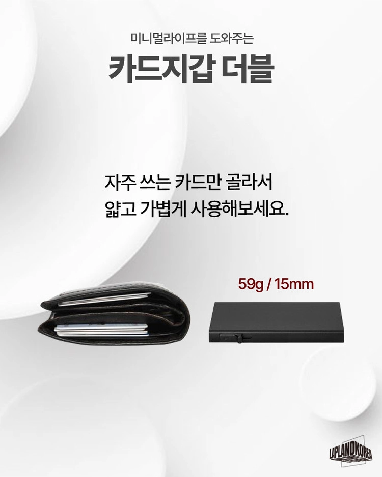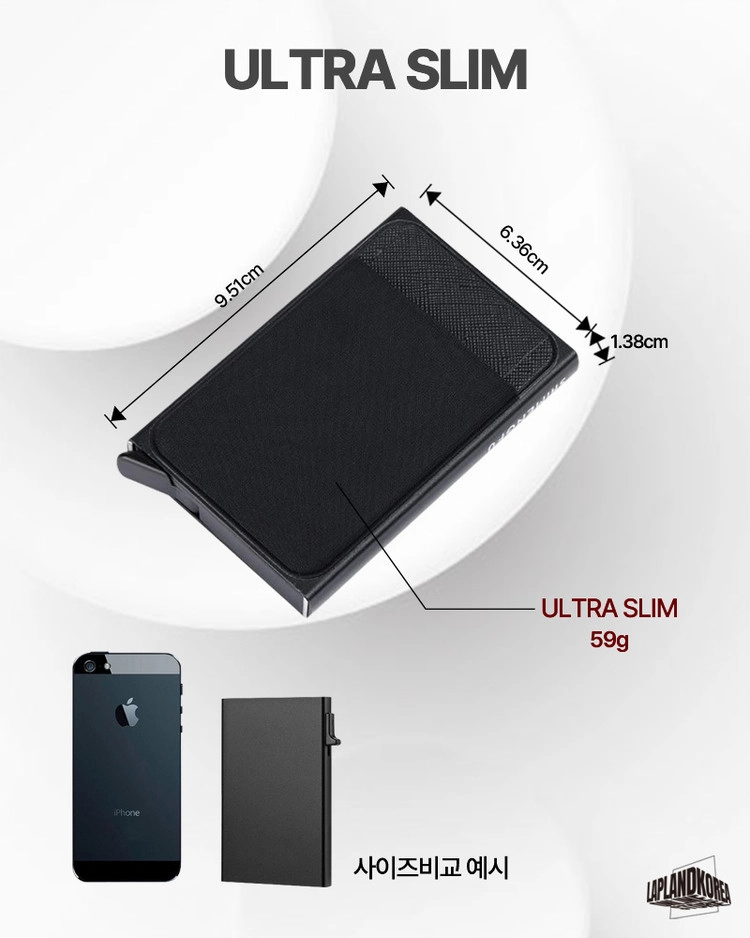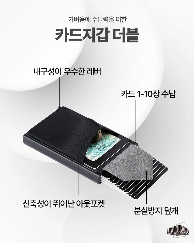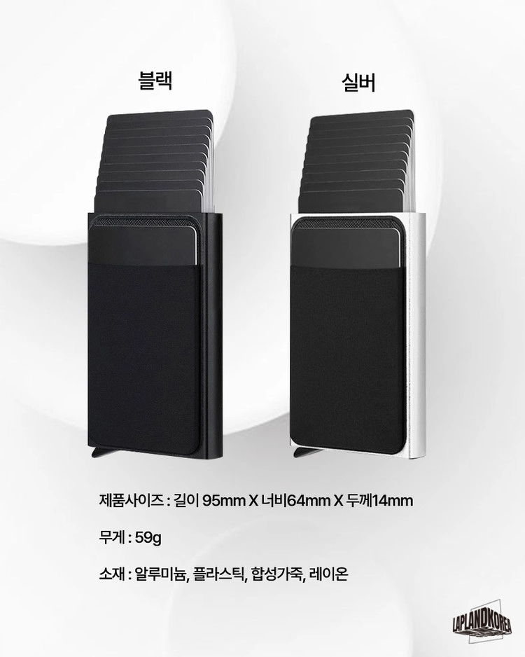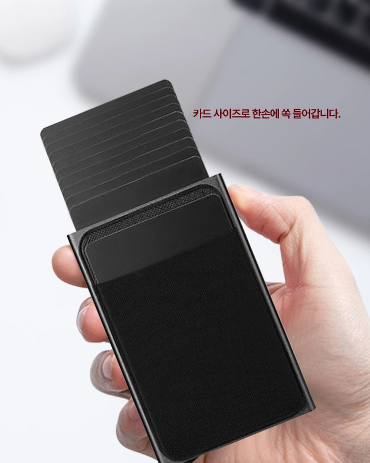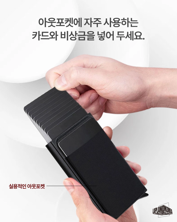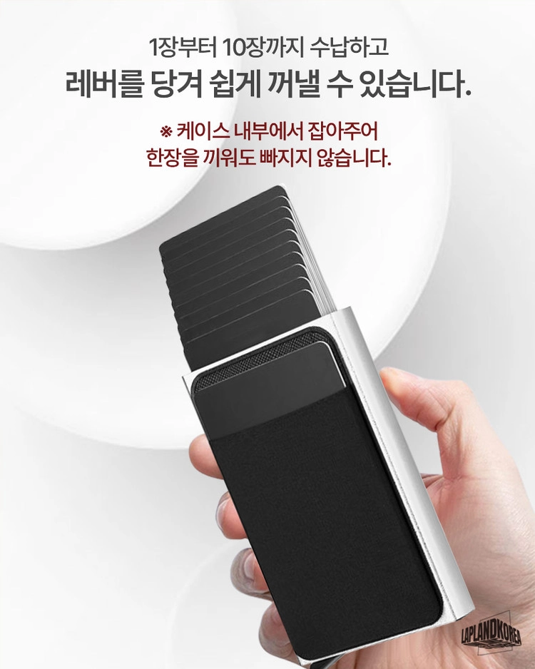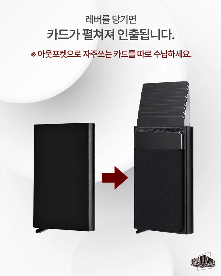 사용방법 : 레버를 내리면 카드가 계단식으로 인출되는 가벼운 알루미늄 소재의 카드홀더 입니다. 케이스 외부에 신축성있는 원단의 플러스 포켓이 있어 자주 쓰는 카드와 비상금을 따로 수납할 수 있습니다.